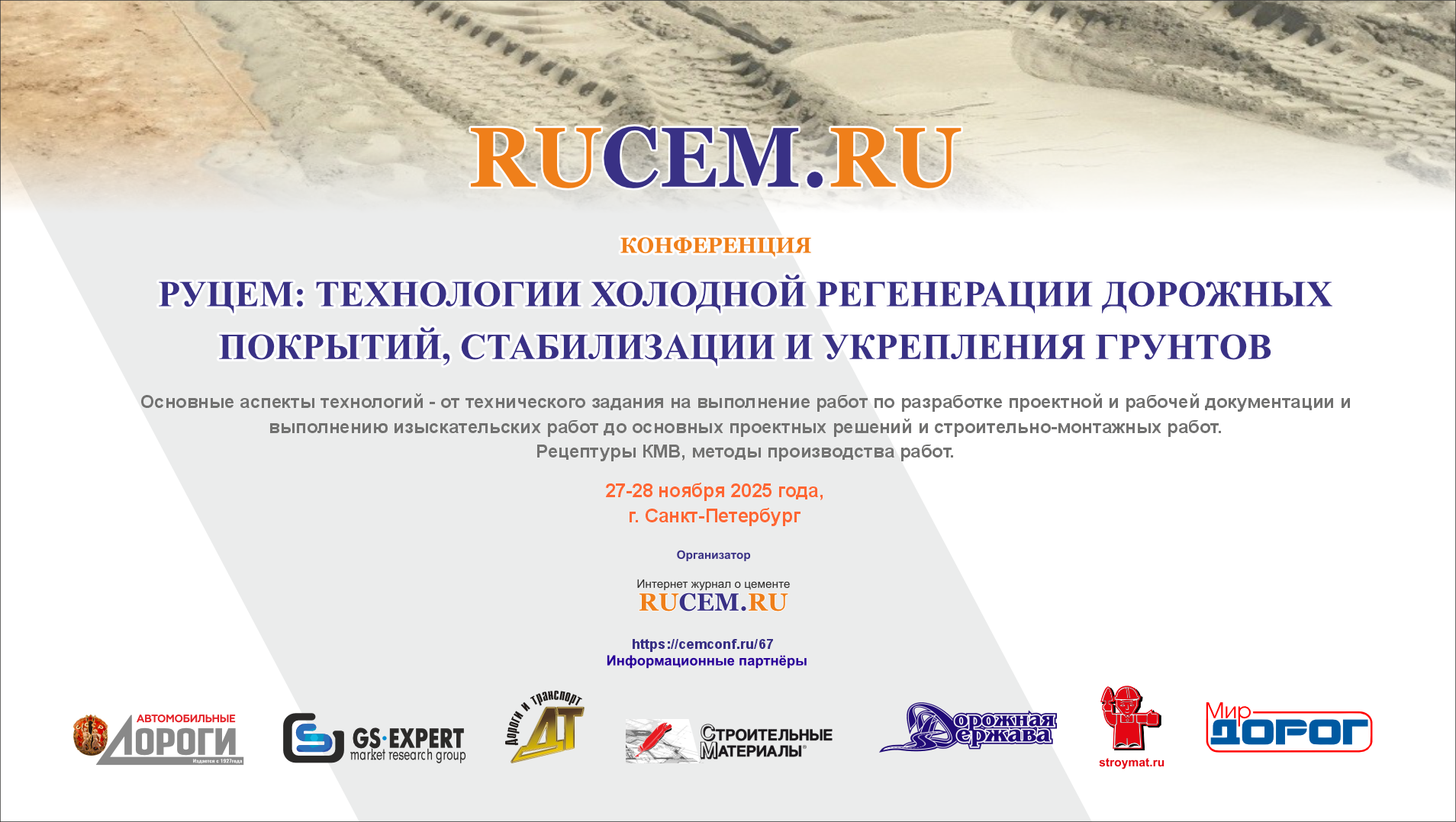 27-28 ноября 2025 года в С-Петербурге в отеле Космос Прибалтийская состоится очередная конференция РУЦЕМ: ТЕХНОЛОГИИ ХОЛОДНОЙ РЕГЕНЕРАЦИИ ДОРОЖНЫХ ПОКРЫТИЙ, СТАБИЛИЗАЦИИ И УКРЕПЛЕНИЯ ГРУНТОВ,